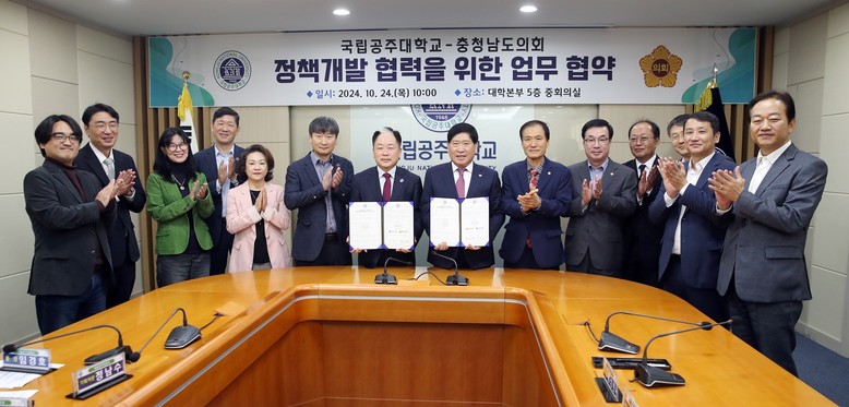 [충남 세계타임즈=송민수 기자] 충남도의회(의장 홍성현)는 24일 도내 유일의 국립대학교인 공주대학교와 정책연구 등 활발한 정책 협력체계 구축 및 상호협력 강화를 위한 ‘충청남도의회-공주대학교 정책연구협력 협약(MOU)’을 체결했다.