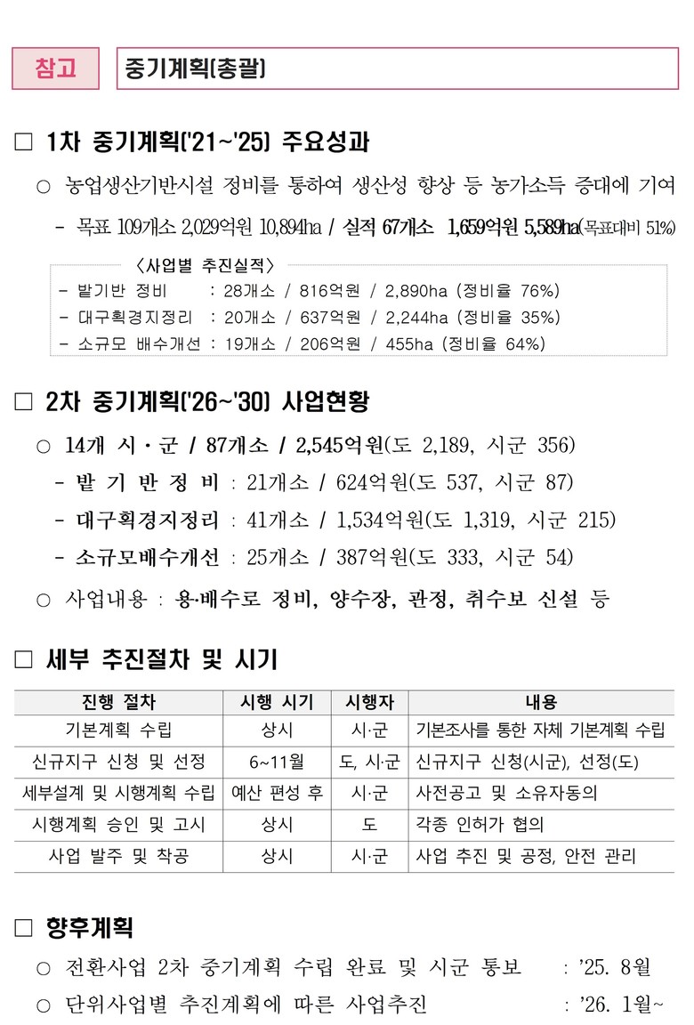이어 사업의 지속성 및 영농환경 개선 등을 위해 2026년부터 2030년까지 총 5년간 전환사업(밭기반정비, 대구획경지정리, 소규모배수개선) 87개소에 2,545억원(도비 2,189, 시군비 356)을 연차적으로 투입 할 계획이다.