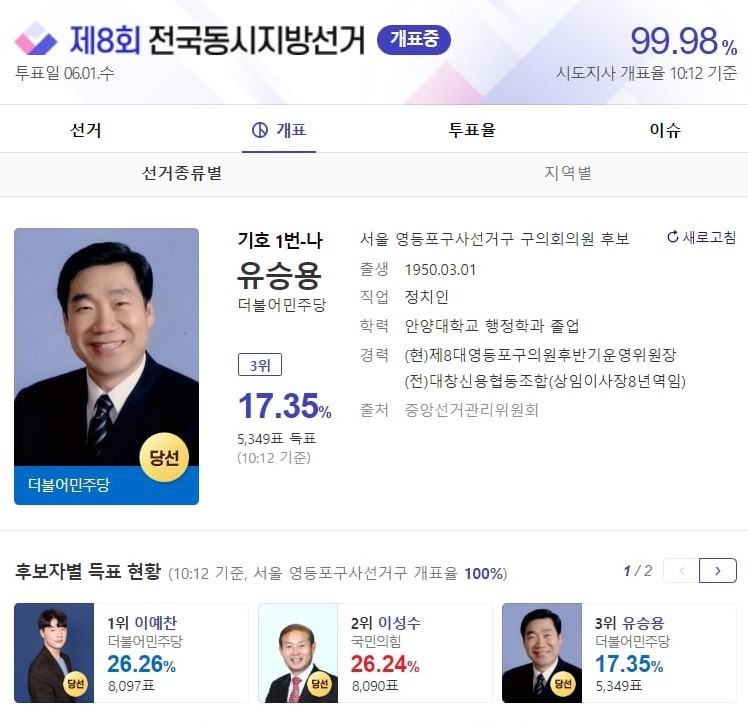[세계타임즈 백진욱 기자] 더불어민주당 유승용 후보가 제 8회 전국동시지방선거 서울 영등포구사선거구에서 구의회의원으로 당선됐다.