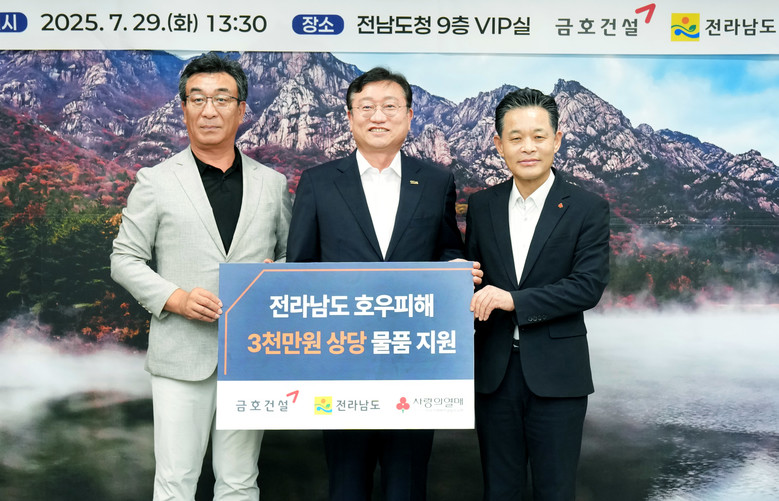 [전남 세계타임즈=우덕현 기자] 전라남도는 금호건설㈜이 집중호우로 큰 피해를 본 전남지역 주민과 자원봉사자를 돕기 위해 3천만 원 상당 물품을 기탁했다고 밝혔다.