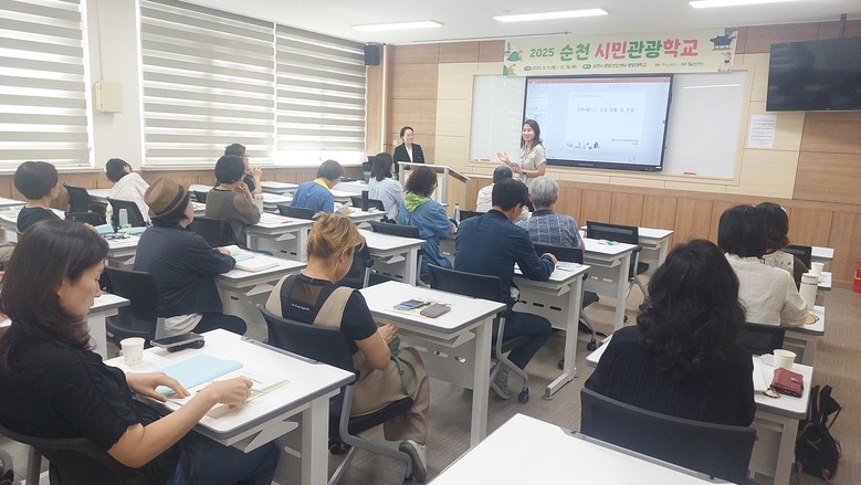 | ▲ 순천 시민관광학교에 참여한 시민들이 치유분야 강좌를 듣고 있다 |