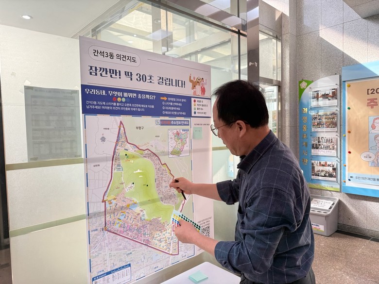 간석3동 행정복지센터 2층에는 관내 지도를 활용한 ‘우리동네 의견지도’를 설치하여 주민들이 직접 문제 지역이나 개선이 필요한 곳을 스티커와 메모로 표시할 수 있도록 했다.