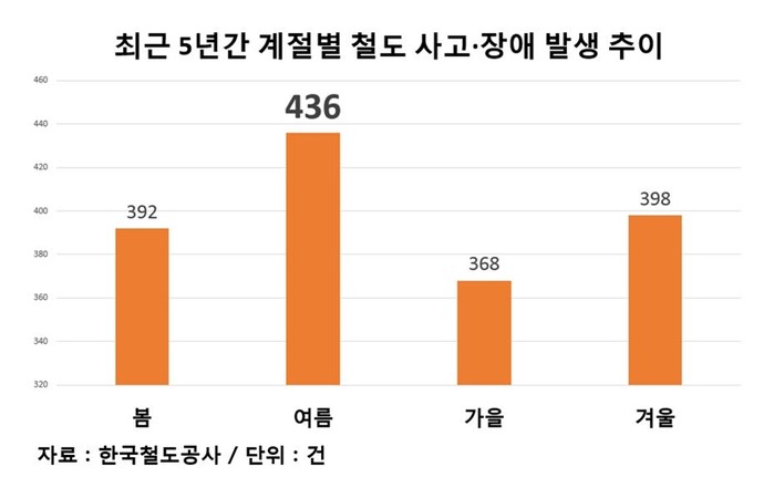 | ▲최근 5년간(2014~2018) 계절별 철도 사고·장애 발생 추이 |