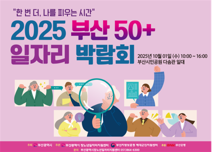 ◈ 박람회에는 50세 이상 일자리에 관심 있는 사람뿐 아니라, 시민 누구나 참가할 수 있어… [부산 세계타임즈=이용우 기자] 부산시(시장 박형준)는 내일(10월 1일) 오전 10시부터 오후 4시까지 부산시민공원 다솜관 일대에서 신중년* 세대의 인생 2막 도전을 지원하는 「2025년 부산 50플러스(+)일자리 박람회」를 개최한다고 밝혔다.