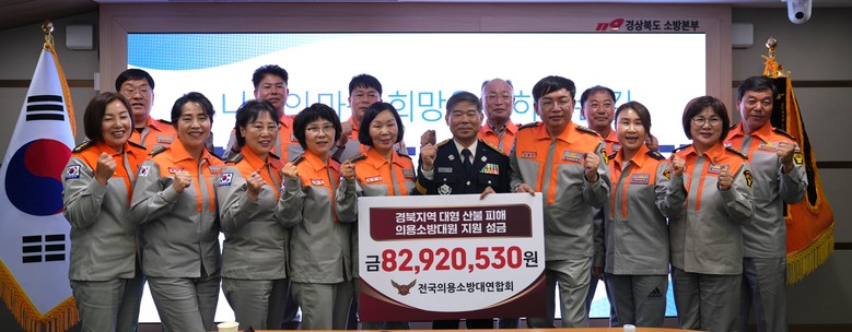 [경북 세계타임즈=한윤석 기자] 전국의용소방대연합회는 24일 오전 11시, 경북소방본부에서 최근 대형 산불로 피해를 본 경상북도 지역 의용소방대원을 위한 성금 8,292만 원을 전달했다.