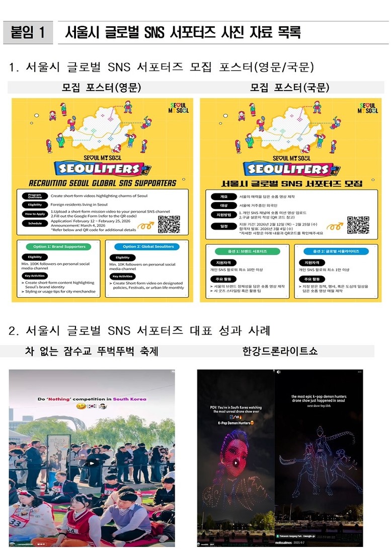 특히 올해부터는 팔로워 10만 명 이상을 보유한 외국인 인플루언서를 선발하여 서울시 도시브랜드를 해외 트렌드에 맞춘 숏폼 콘텐츠로 제작·확산하는 ‘서울브랜드 서포터즈’를 신설할 계획이다.