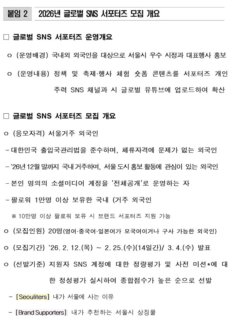 - 서울시 글로벌 유튜브·인스타그램 등 다채널 통해 외국인 시각의 서울 확산 [성룰 세계타임즈=이장성 기자] 서울시는 서울의 다양한 모습을 외국인 시각으로 소개하는 2026년 글로벌 SNS 서포터즈 ‘서울라이터즈(Seouliters)’ 3기를 2월 12일(목)부터 25일(수)까지 모집한다고 밝혔다.