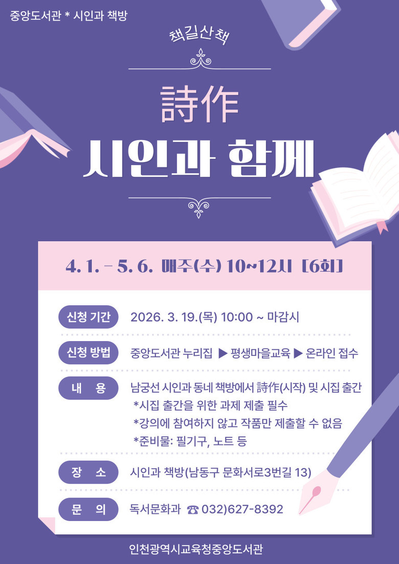 프로그램은 인천 출신의 남궁선 시인과 함께 시를 쓰고 시집을 출판하는 과정으로 구성했으며, 남동구 구월동에 위치한 동네 서점 ‘시인과 책방’에서 4월 1일부터 5월 6일까지 매주 수요일에 운영한다.