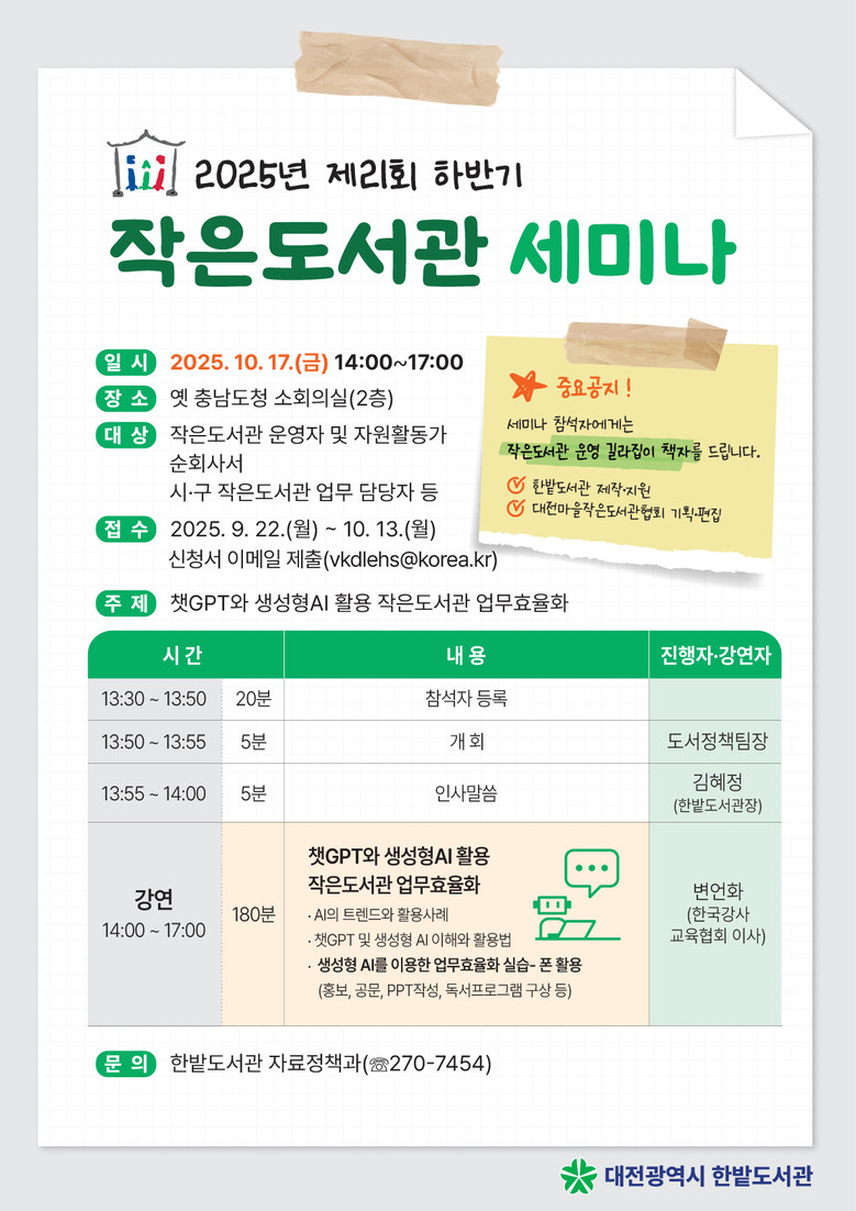 이번 세미나에는 변언화 한국강사교육협회 이사의 ‘챗GPT와 생성형AI 활용 작은도서관 업무효율화’에 대한 강연을 진행하며 ▲챗GPT 및 생성형 AI 이해와 활용법 ▲모바일 기반 업무효율화 실습(홍보, PPT, 독서프로그램 구상 등)으로 구성된다.
