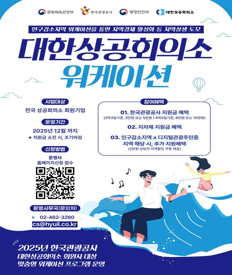 한국관광공사의 ‘2025 휴가지 원격근무(워케이션)’ 프로그램 지원 대상은 전국 기업·기관 재직자다. 참가자는 2~4박 기간 중 공사 지원금 혜택과 시 숙박 지원금 혜택을 중복으로 지원받을 수 있으며, 대한상공회의소 회원사의 경우 참가비를 추가 지원받을 수 있다.