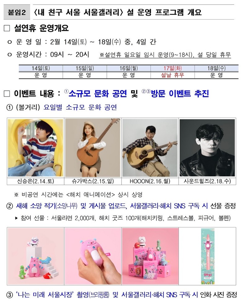 시는 설 연휴를 맞아 14일(토)부터 18일(수)까지(17일 제외) 시민과 국내외 관광객 누구나 방문하여 즐길 수 있는 다채로운 콘텐츠로 서울갤러리를 가득 채웠다고 밝혔다.