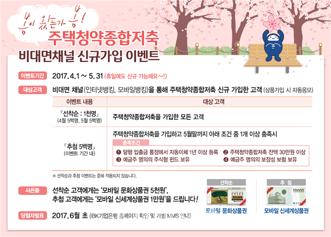 기업은행 관계자는 “저녁, 휴일 등 시간에 제약없이 비대면채널을 통해 손쉽게 주택청약종합저축을 가입하고 경품의 기회도 기대할 수 있는 이벤트”라고 말했다.