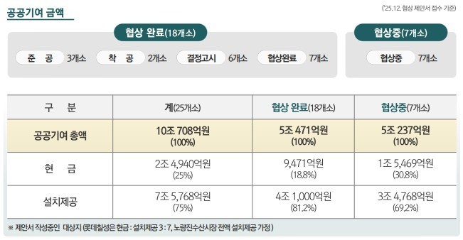 현재 기준 확보된 공공기여 중 ▴‘현금’은 약 2조5천억 원(25%) ▴도로.건축물.시설개선 등 기부채납 형식의 ‘설치 제공’이 약 7조5천억 원(75%)을 차지한다.