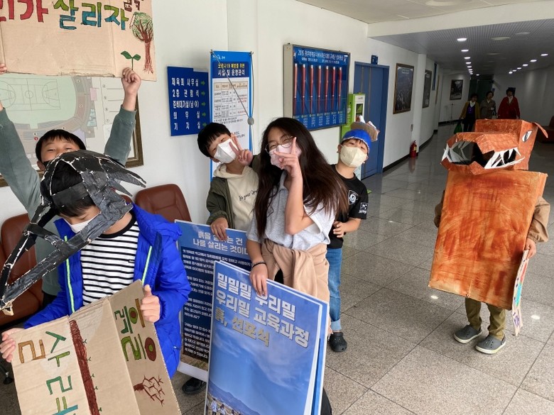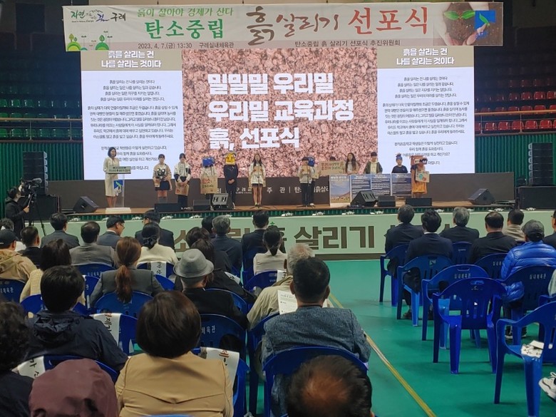 문척초 5.6학년 학생은 지난 7일 구례 서시천 체육공원에서 열린 '흙이 살아야 지구가 산다' 선포식에서 '흙기사'를 자처하며 선언문을 낭독했다.