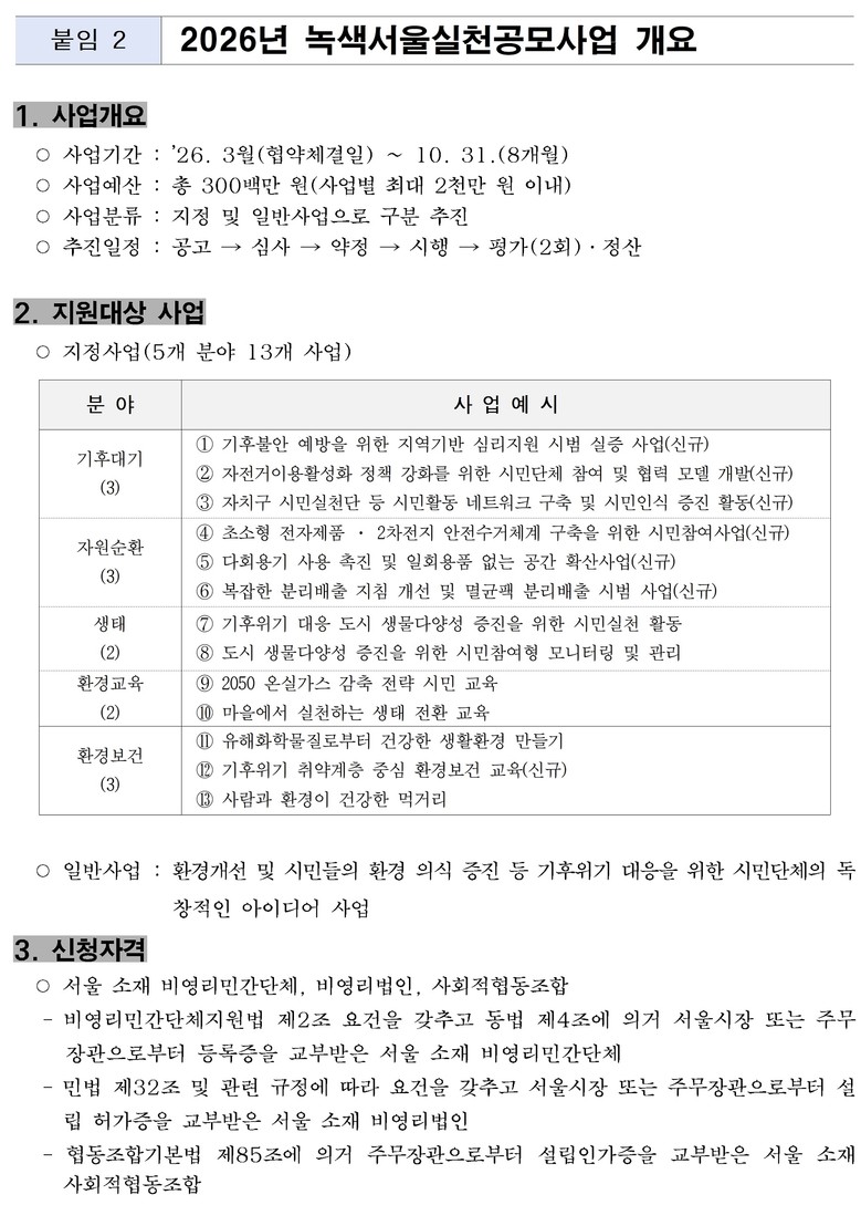 서울 소재 비영리민간단체·비영리법인·사회적협동조합을 대상으로 환경과 자원순환 분야 사업에 대해서 총 3억원(사업당 최대 2천만원)을 지원할 계획이다.