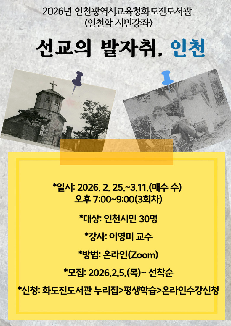 이번 시민강좌는 2월 25일부터 3월 11일까지 매주 수요일 저녁 7시 비대면 방식으로 운영하며, 한국 근현대사에서 역사적 발자취를 남긴 서양인 선교사 중 인천 지역에서 의미 있는 활동을 펼친 인물을 소개한다.