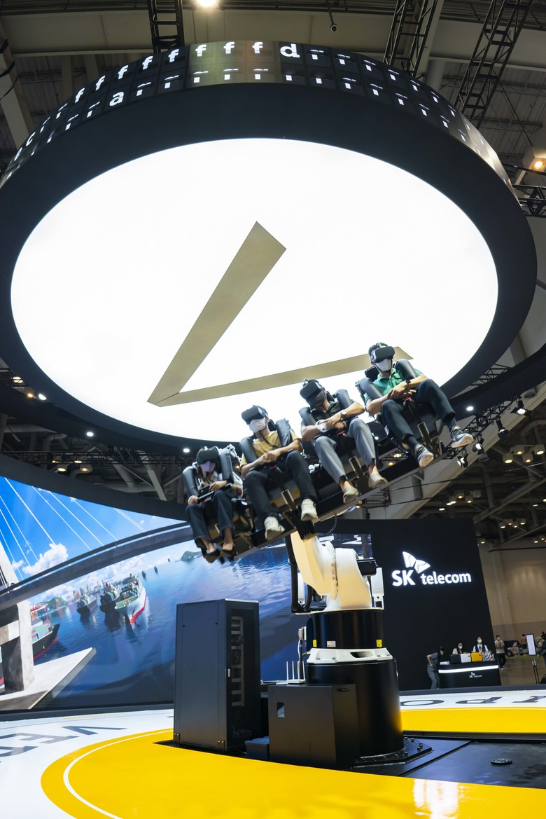 SKT는 로봇팔 시뮬레이터를 이용한 가상 UAM 체험을 통해 관람객들이 첨단 이동통신·자율주행·인공지능 기술이 융합된 SKT의 모빌리티 혁신 방향을 확인할 수 있도록 콘텐츠를 구성했다.