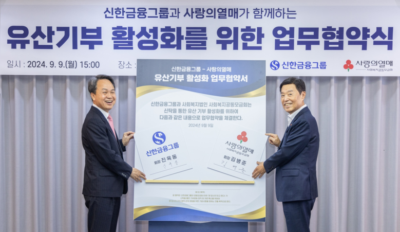 신한금융 진옥동 회장은 “이번 업무협약을 통해 우리 주변의 이웃들에게 따뜻한 마음을 전하고자 하는 고객들에게 기회를 제공할 수 있어 뜻깊게 생각한다”며, “신한금융은 고객 자산의 안전한 관리와 함께 기부문화 확산을 위한 다양한 노력을 이어 가겠다”고 밝혔다.