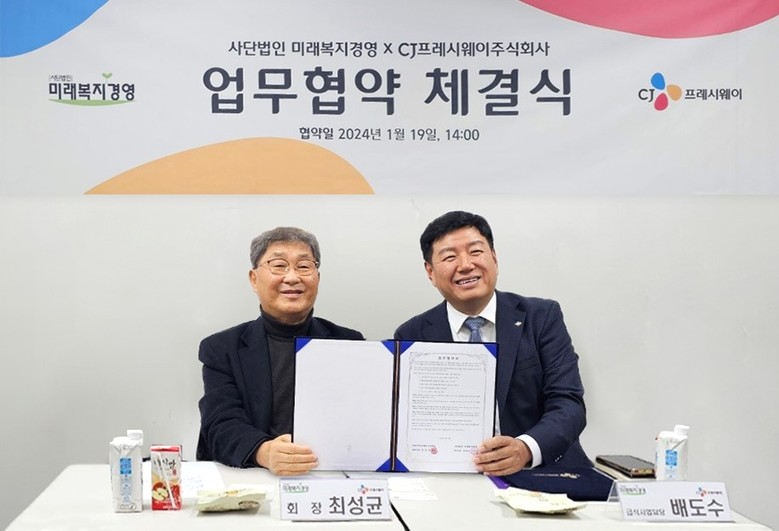 [세계타임즈 = 이현진 기자] CJ프레시웨이가 지난 19일 사단법인 미래복지경영과 업무협약을 맺고 사회복지시설의 급식 서비스 협력 강화에 나선다. 사회서비스 NGO 단체인 미래복지경영은 사회복지 연구 · 교육 · 정책제안 등 다양한 사업을 전개하고, 아동 · 청소년 · 노인 등을 위한 사회복지시설을 운영하고 있다.