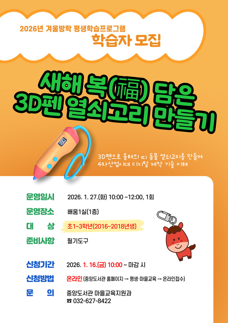 2019~2020년생 유아를 대상으로 하는 「고양이랑 떠나는 마음 그림책 여행」과 초등학교 1~3학년을 대상으로 하는 「새해 복(福) 담은 3D펜 열쇠고리 만들기」 프로그램으로 운영된다.