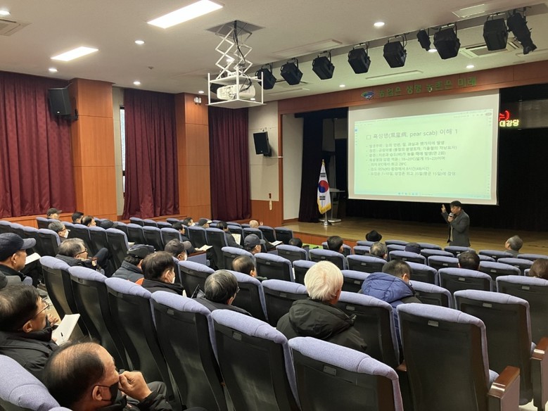 이어 김병준 팀장은 ‘배나무 살균제 활용기술(검은별무늬병)’을 주제로 △예방·치료 살균제의 적기 처리 방법 △검은별무늬병 군별 약제 정리 △2026년 배 과원 실천 기술 △전정·시비의 균형 관리 등 현장 적용 중심의 내용을 상세히 설명했다.