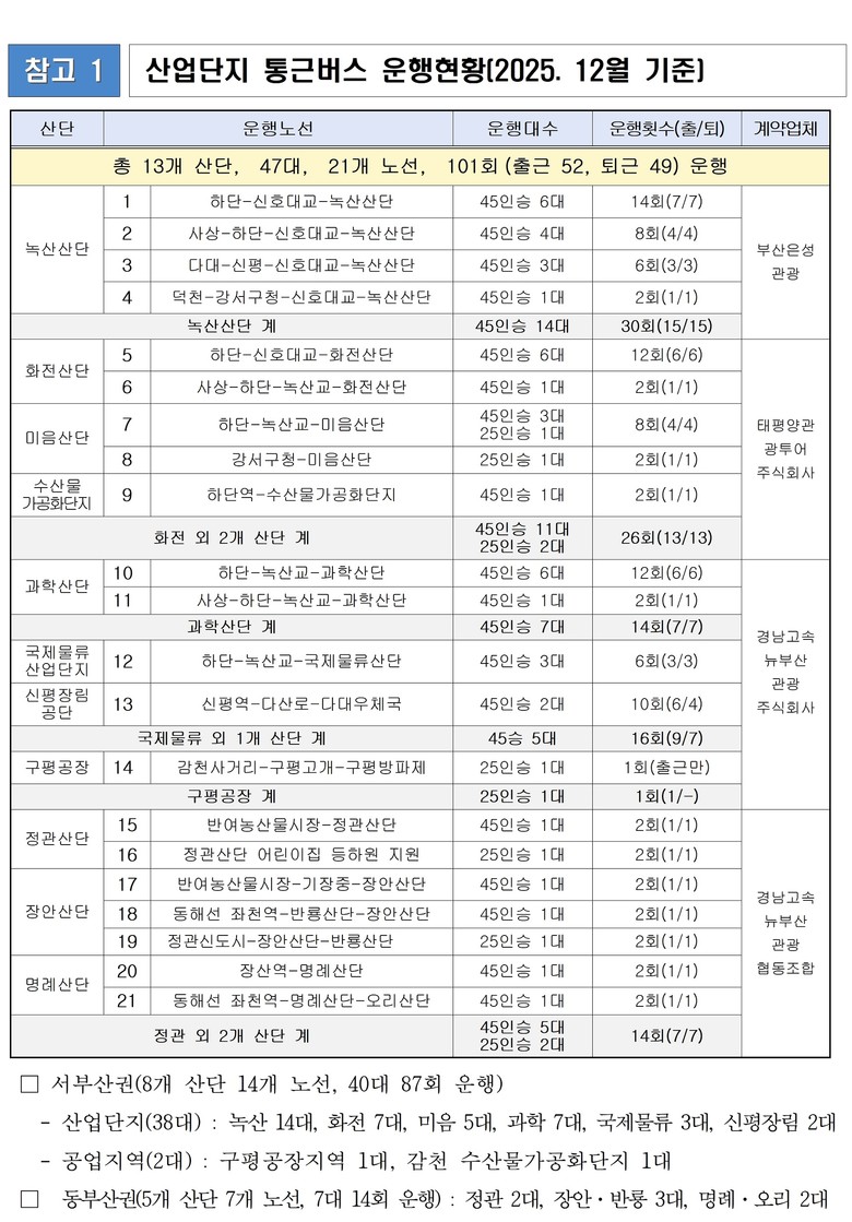 시는 부산경제진흥원(원장 송복철)을 통해 산업단지 통근버스 운행 사업을 추진하고 있으며, 2년 단위 공개입찰을 통해 운행업체를 선정하고 있다. 2026년 3월부터 2028년 2월까지 운영할 업체 선정을 위한 입찰은 2026년 1월 초에 추진할 계획이다.