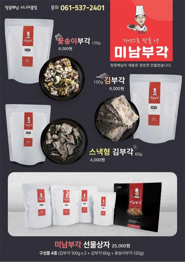 기획전 주요 생산품은 ▲여수시니어클럽 김치류 ▲순천시니어클럽 손질멸치·누룽지세트 ▲고흥시니어클럽 참깨 누룽지 ▲보성시니어클럽 녹차 기름 세트 ▲완도시니어클럽 김·유자사과 주스 세트 등이다. 온라인뿐만 아니라 오프라인 판매처를 통해서도 구입할 수 있다.