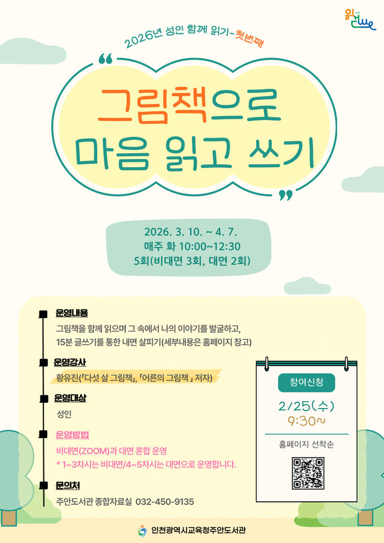 참여 신청은 주안도서관 누리집에서 25일부터 진행되며, 자세한 사항은 도서관 누리집을 확인하거나 종합자료실(☎032-450-9135)로 문의하면 된다.