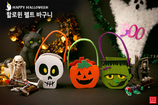 할로윈 파티 시 어린이들의 호박모양 바구니에 달콤한 사탕을 나눠주는 트릭 오어 트릿(Trick or Trick)을 위한 소품도 만나볼 수 있다. ▲호박바구니와 ▲야광호박바구니는 작은 사이즈와 큰 사이즈 두 종류로 준비되어 있으며, 가격은 각각 1000원(소), 2000원(대)이다. 호박 무늬 외에도 해골과 프랑켄슈타인 모양의 ▲할로윈펠트바구니(1000원)로 개성을 표출할 수 있다.
