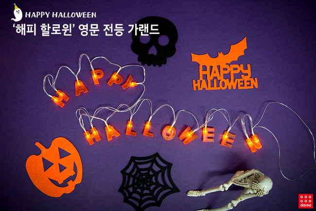 작은 아이템으로 할로윈 분위기를 물씬 풍길 수 있는 인테리어 소품 70여종이 준비되어 있다. 특히 어두운 실내에서 사용하는 조명 장식들이 보다 다양하게 마련했다. ▲’해피할로윈’영문전등가랜드(5000원) ▲할로윈조명장식(3000원) ▲LED호박가랜드(5000원) 등 취향에 맞는 가랜드를 벽에 걸어두기만 하면 분위기를 한층 업그레이드할 수 있다.