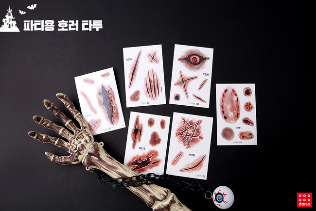 할로윈 파티를 위한 호러 분장부터 귀여운 패션 아이템도 준비돼 있다. 손쉽게 붙일 수 있는 ▲파티용호러타투(1000원)를 활용하면 실제 상처가 난 듯한 피부를 연출할 수 있다. 도끼나 톱이 꽂혀있는 듯한 ▲할로윈호러머리띠(1000~2000원) 사람들을 놀래킬 수 있는 ▲튀어나오는 눈알안경(1000원) 등을 활용하면 호러틱 분위기를 강화할 수 있다.