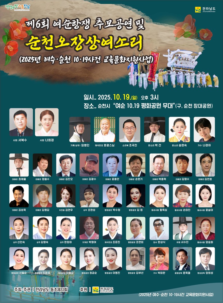 19일에는 순천 여순10·19 평화공원에서 ‘여순사건 추모공연 및 순천오장상여소리’ 행사를 개최한다. 여순사건을 뮤지컬 형식으로 풀어내 희생자에 대한 애도를 표현하고, 유가족과 시민이 함께 참여해 기억을 공유하는 추모의 장으로 마련된다.