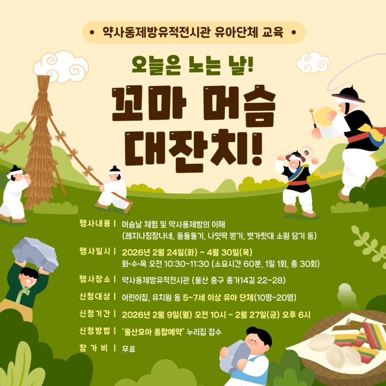 2월 9일~27일까지 선착순 모집 [울산 세계타임즈=이호근 기자] 울산 약사동제방유적전시관이 관내 어린이집과 유치원 원아(5세~7세)를 대상으로 머슴날(음력 2월 1일)과 관련한 교육 프로그램 ‘오늘은 노는 날! 꼬마 머슴 대잔치!’를 운영한다.