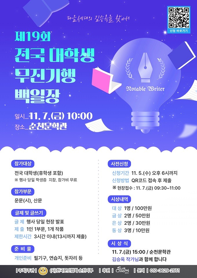 이번 백일장은 순천 출신의 소설가 김승옥 작가의 문학정신을 기리고, 전국의 대학생들에게 문학적 상상력과 창작의 열정을 펼칠 기회를 제공하기 위해 마련됐다.