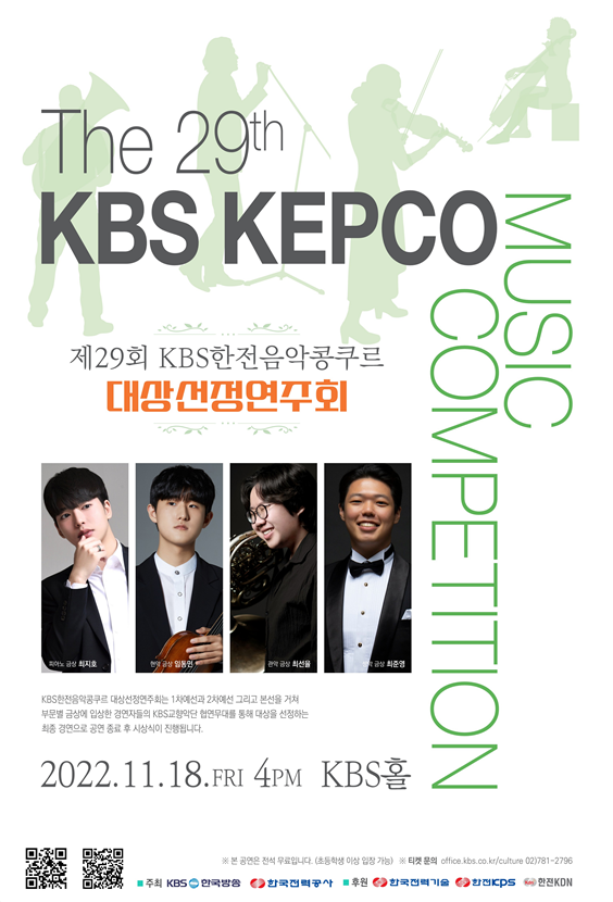 KBS와 한국전력이 주최하고 한전KPS, 한전KDN, 한전기술이 후원하는 국내 최고 명성의 KBS한전음악콩쿠르가 준비한 2022년 마지막 주인공을 위한 스포트라이트 무대, 제29회 KBS한전음악콩쿠르 대상선정연주회에 음악 애호가 여러분의 많은 관심과 응원 바란다.
