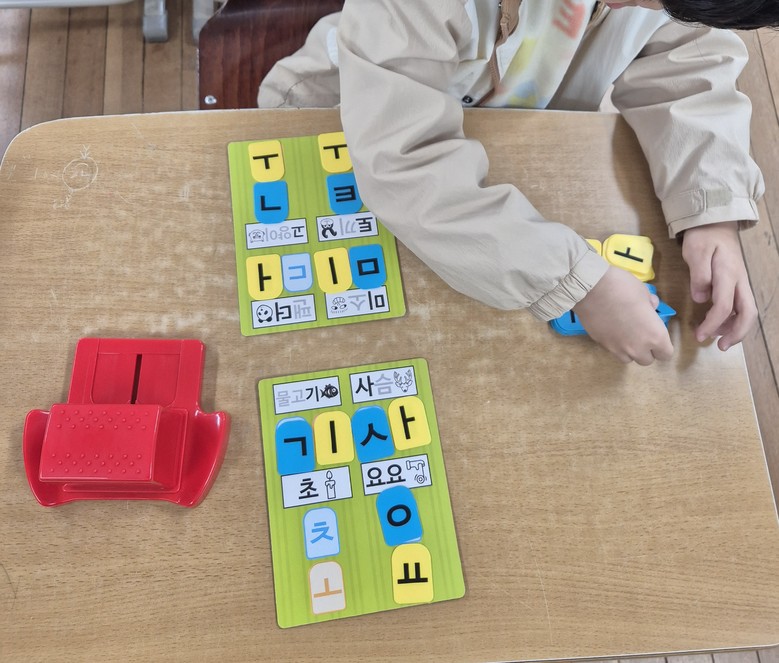 | ▲ 지난해 성진초등학교에서 문해력 향상 지도 모습(엘코닌 상자를 이용한 한글 자모음 위치 지도 및 자음모음 소리 찾기)/광주시교육청 제공 |