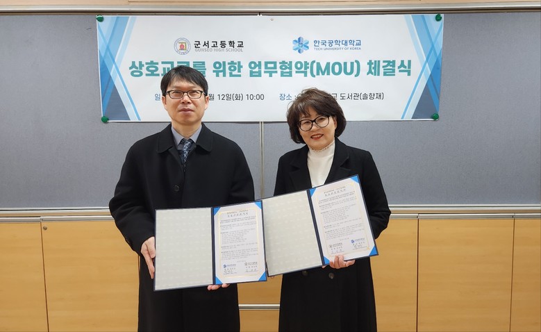 [시흥시 세계타임즈=송민수 기자] 경기 시흥시 군서고등학교(교장 김미희)와 한국공학대학교(총장 박건수)는 12월 12(화) 군서고 도서관 솔향제에서 상호 협력 체계 구축을 통해 미래형 인재 양성을 목적으로 MOU 체결하였다.