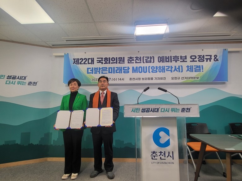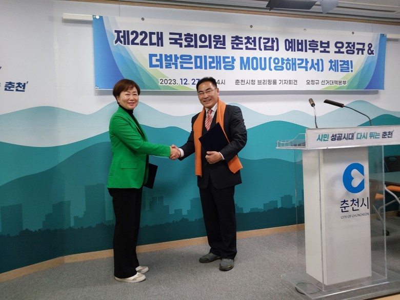[세계타임즈]최성룡기자 = 더밝은미래당(대표 서정미)과 오정규 선거대책본부와 각계층 시민단체들은 지난 12월 27일(수) 14시 / 춘천시청 8층 브리핑룸에서 “양해각서 체결” 요지의 기자회견을 진행하였다.