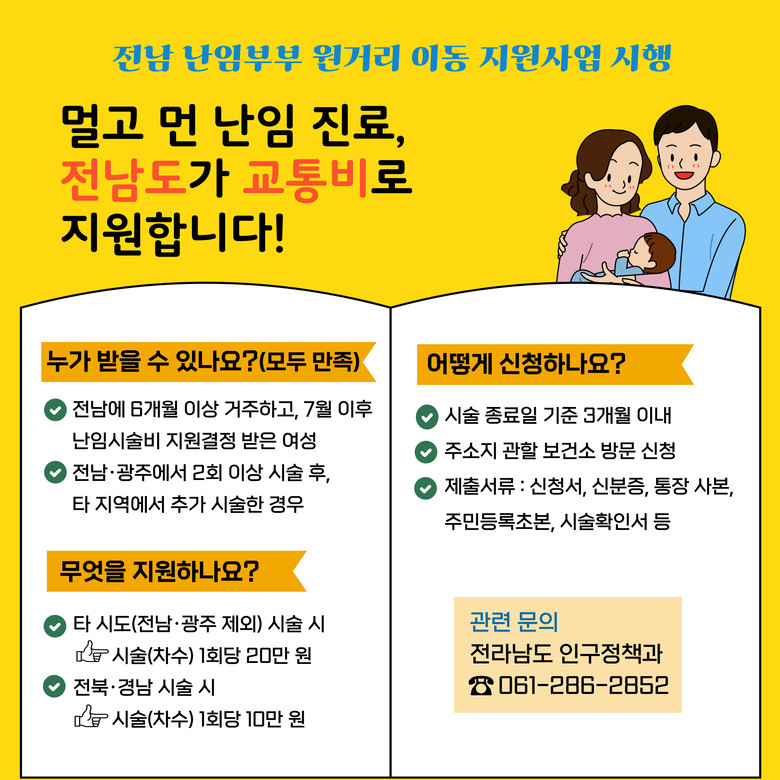 사업은 전남지역에서 시술에 실패해 불가피하게 타 시·도 의료기관에서 시술받은 경우, 시술 차수 1회당 교통비를 전북·경남 지역은 10만 원, 그 외 지역은 20만 원을 지원한다.