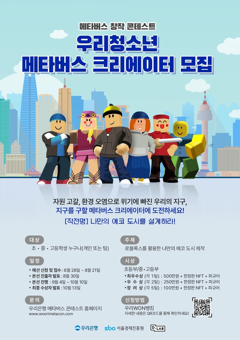 이번 콘테스트를 위해 우리은행은 지난달 ‘서울경제진흥원(SBA)’및 코딩교육 스타트업 ‘디랩’과 업무협약을 체결했다. 이번 협약으로 각 기관은 △메타버스 콘테스트 공동마케팅 △청소년 디지털 교육에 적극 협력해 나가기로 했다. 우리은행은 디랩의 교육 서비스와 서울경제진흥원의 인프라를 활용해 청소년 대상 디지털·금융 교육 지원에 앞장설 예정이다.