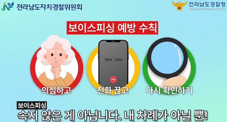 이에 전남자치경찰위원회는 젊은 세대부터 고령층까지 누구나 쉽게 이해할 수 있도록 짧고 직관적인 숏폼 형식의 보이스피싱 예방 영상을 제작해 배포하고, 전남자치경찰위원회 누리집을 통해 누구나 다운받아 활용할 수 있도록 했다.