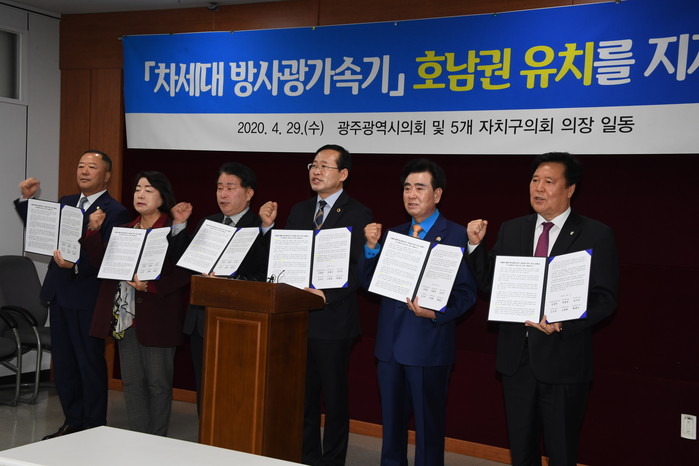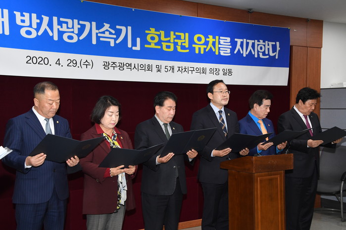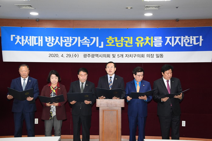 광주시의회 김동찬 의장과 5개 자치구 의회 의장(동구의회 박종균, 서구의회 강기석, 남구의회 조기주, 북구의회 고점례, 광산구의회 배홍석)은 29일, ‘4세대 원형 방사광가속기’의 호남권 유치를 지지하는 성명을 발표했다.