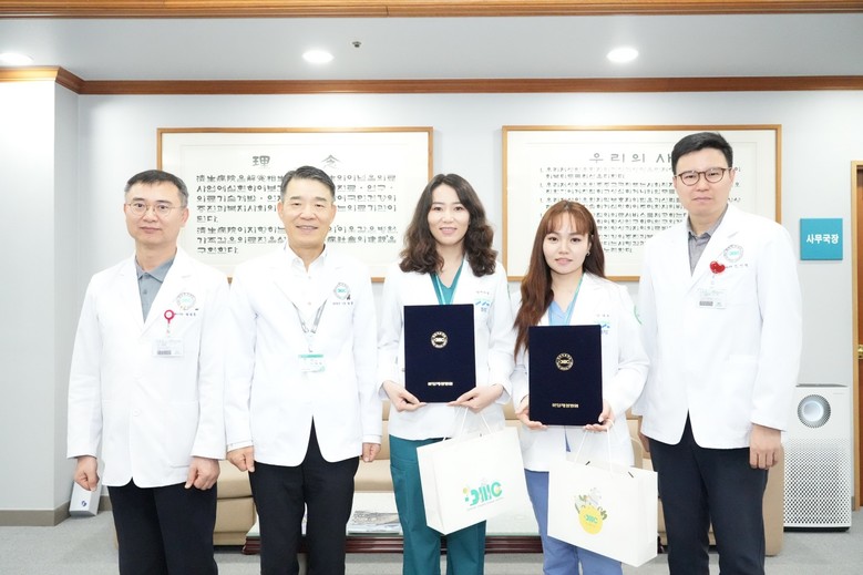 | ▲분당제생병원 해외 연수의 수료식_왼쪽부터 박상종 국제진료센터 소장, 나화엽 병원장, 절자르갈 바툴가 소화기센터 연수의, 난살마 앵흐바트 심장혈관센터 연수의, 오민석 심장혈관내과 과장(사진=분당제생병원) |