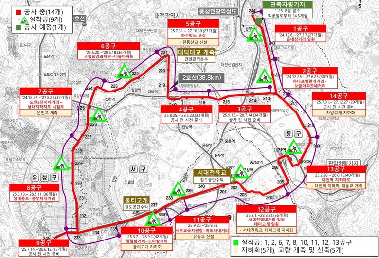 특히 교통량이 많은 ▲9공구(진잠네거리~건양대병원사거리)는 진잠 방면 2개 차로를 통제해 기존 10차로에서 8차로로 축소 운영되며, ▲14공구(동아공고네거리)도 가양네거리부터 대주파크빌 앞 네거리까지 2개 차로가 통제된다.