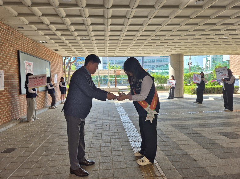 또래 상담자 학생들이 피켓을 높이 들고‘상처받은 친구 마음, 감싸주는 우리 우정’, ‘폭력 없는 우리 학교, 교실마다 웃음 가득’이라고 목청껏 외치는 메시지는 학생들에게 서로 공감하고 존중하는 자세를 되새겨보는 계기가 되었다.