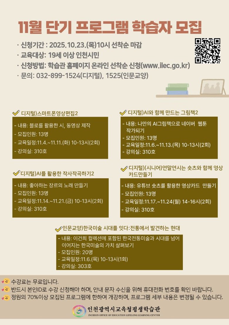수강 신청은 10월 23일(목) 오전 10시부터 평생학습관 누리집(https://www.ilec.go.kr/)에서 가능하며, 자세한 사항은 공지사항에서 확인하거나 평생교육부(☎032-899-1524, 1525)로 문의하면 된다.