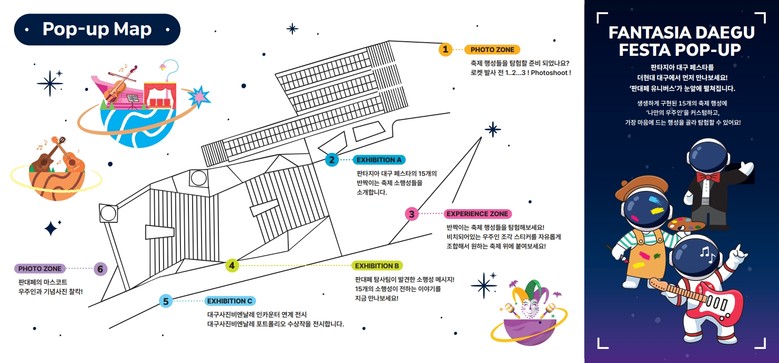 이번 팝업전시에서는 소행성으로 새롭게 태어난 15개의 개별축제가 가진 특색을 찾아보는 재미와 우주인 조각 스티커를 부착해 나만의 우주인을 제작하며 축제를 탐험하는 방문객 체험 공간도 제공된다.