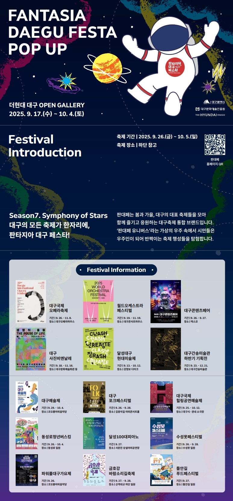▸ 축제주간 방문객 대상 다양한 연계 이벤트 및 할인 혜택 제공 [대구 세계타임즈=한윤석 기자] 2025 판타지아대구페스타 가을 축제가 일곱 번째 시즌(Season7. Symphony of Stars 별들의 노래)을 맞아, 대구를 대표하는 15개 축제를 소개하는 팝업 전시와 함께 다양한 이벤트로 시민들을 찾아간다.