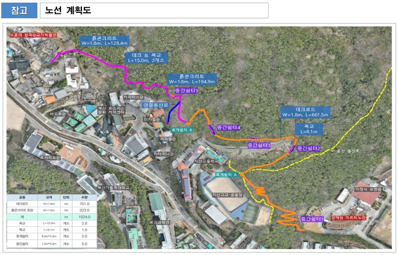 주요 시설은 ▲목교 3곳 ▲휴게 쉼터 2곳 ▲중간 쉼터 5곳을 비롯해 ▲종합·테마 안내판 ▲방향 표지판 ▲벤치 등 보행 약자를 배려한 편의시설이 포함된다.