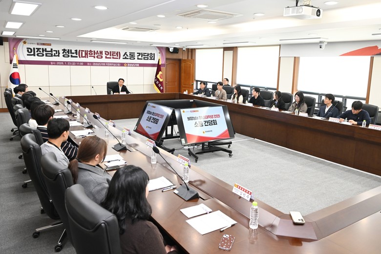 [경남 세계타임즈=최성룡 기자] 경상남도의회(의장 최학범)는 23일 도의회 의정회의실에서 제3기 대학생 인턴십 참여 학생 및 수료생 등 20여 명의 경남 청년들과 함께 민생현안 파악 및 의정활동 방향 모색을 위한 “의장-청년(대학생 인턴) 소통 간담회”를 개최했다.
